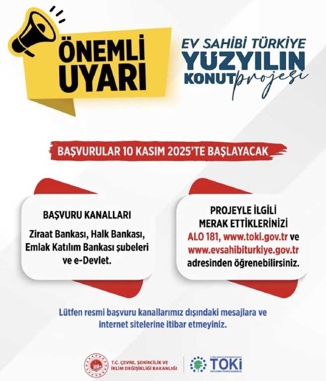 “Proje ile ilgili merak ettiğiniz tüm sorulara ALO 181 hattımız, toki.gov.tr ve evsahibiturkiye.gov.tr adresli internet sitelerimiz üzerinden ulaşabilirsiniz. Lütfen resmi başvuru kanallarımız dışındaki mesajlara ve internet sitelerine itibar etmeyiniz.”
