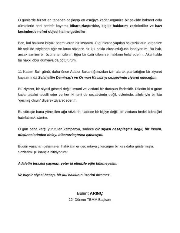 Bülent Arınç ayrıca, 11 Kasım’da Adalet Bakanlığı’ndan izin alarak hem Osman Kavala’yı hem de Selahattin Demirtaş’ı cezaevinde ziyaret edeceğini duyurdu. Bu ziyaretin “siyasi değil, insani bir duruş” olduğunu belirten Arınç, “Dilerim ki o güne kadar adalet tecelli eder ve onları cezaevinde değil, evlerinde ziyaret ederim” dedi.