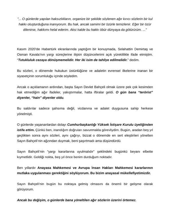 Arınç, 2020’de Habertürk canlı yayınında yaptığı açıklamada “Tutukluluk cezaya dönüşmemelidir. Demirtaş ve Kavala tahliye edilmelidir” sözlerinin ardından hem siyasilerden hem de kamuoyundan ağır tepkiler aldığını belirtti. “Bana hain, terörist, Kandil’in sözcüsü diyenler oldu” diyen Arınç, bugün MHP Genel Başkanı Devlet Bahçeli’nin Demirtaş’ın tahliyesi için yaptığı çağrının dikkat çekici olduğunu vurguladı.