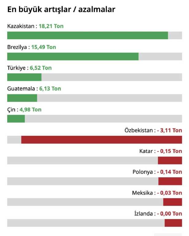 Bu alımlar Türkiye’yi toplam rezerv sıralamasında da yukarı taşıdı. Daha önce 10. sırada yer alan Türkiye, toplamda 641,28 ton altınla 9. sıraya yükseldi ve birçok Avrupa ülkesini geride bıraktı.