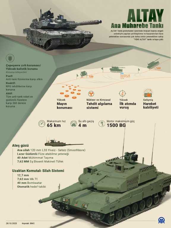 Seri üretime giren ALTAY prototipleri üzerinde yapılan yerlileştirme ve ilave yetenek kazanımlarıyla “YENİ ALTAY” olarak anılan versiyon, atışlı testlerde yüksek performans gösterdi. Üstün ateş gücü, gelişmiş koruma sistemleri ve komuta-kontrol yetenekleri ile ALTAY’ın sınıfının en iyileri arasında gösterildiği vurgulandı.