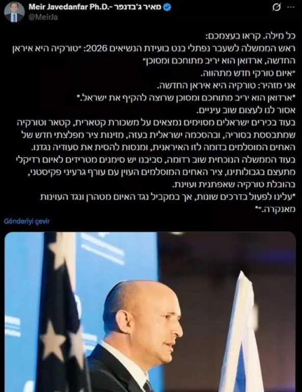 Mevcut İsrail yönetimini pasif kalmakla suçlayan Bennett, ülkesinin hem İran’dan hem Türkiye’den gelen tehditlere karşı eş zamanlı strateji üretmesi gerektiğini söyledi. Açıklamasında Ankara ve Tahran kaynaklı risklerin birlikte ele alınması çağrısında bulundu.