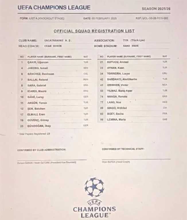 Galatasaray’ın UEFA’ya sunduğu yeni listede, ara transfer döneminde kadroya katılan Noa Lang, Renato Nhaga ve Sacha Boey yer aldı. Üç oyuncu da Şampiyonlar Ligi play-off karşılaşmalarında forma giyme hakkı kazandı.