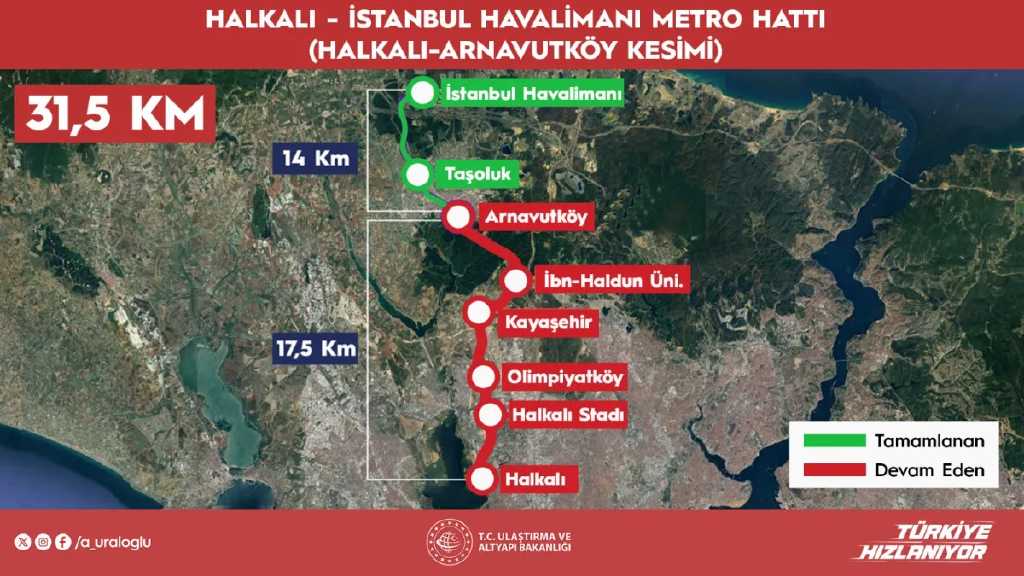 31,5 kilometre uzunluğunda ve 7 istasyondan oluşan Halkalı-İstanbul Havalimanı Metro Hattı’nın 14 kilometrelik Arnavutköy-İstanbul Havalimanı kesiminin hizmete alındığını hatırlatan Uraloğlu, kalan 17,5 kilometrelik Arnavutköy-Halkalı bölümünde çalışmaların hızla devam ettiğini söyledi.
