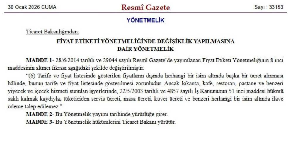 Son dönemde kafe ve restoranlarda yaygınlaşan masa, servis ve kuver ücretleriyle ilgili önemli bir düzenleme hayata geçirildi. Tüketicilerden gelen yoğun şikayetler üzerine Ticaret Bakanlığı, söz konusu uygulamaları yasaklayan yönetmelik değişikliğini Resmi Gazete’de yayımladı.
