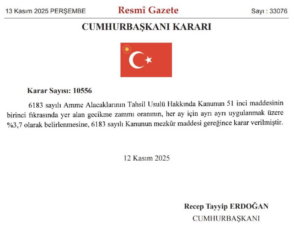Kararda yer alan ifadeye göre gecikme zammı oranı, 6183 sayılı Amme Alacaklarının Tahsil Usulü Hakkında Kanun’un 51’inci maddesi gereğince her ay için ayrı ayrı uygulanmaya devam edecek. Böylece vatandaşın kamu borcundaki gecikme süresi uzadıkça eklenen tutar aylık yüzde 3,7’lik oran üzerinden hesaplanacak.