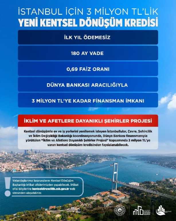 Yeni model kapsamında, kentsel dönüşüme giren vatandaşlara 3 milyon TL’ye kadar finansman desteği sunulacak. Bu destek, Dünya Bankası finansmanlı “İklim ve Afetlere Dayanıklı Şehirler Projesi” çerçevesinde hayata geçirilecek.