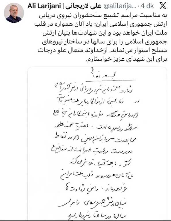 Laricani, el yazısıyla yayımladığı mesajında şehitler için dua etti. Mesajında, İran İslam Cumhuriyeti Donanması mensuplarının cenaze törenine atıfta bulunarak onların hatırasının daima yaşayacağını ifade etti.
