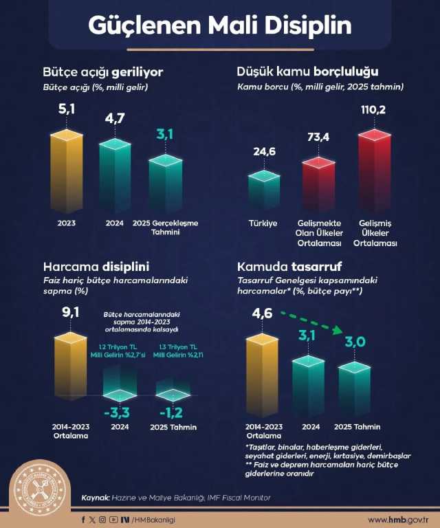 Paylaşılan grafiklerde 2025’te kamu maliyesinde disiplinin güçlendiği vurgulandı. Bütçe açığının gerilediği, düşük kamu borçluluğu, harcama disiplini ve kamuda tasarruf politikalarıyla mali dengenin korunduğu ifade edildi.