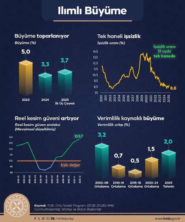 Türkiye ekonomisinin 2023’te yüzde 5, 2024’te yüzde 3,3 büyüdüğü, 2025’in ilk üç çeyreğinde ise yüzde 3,7’lik büyüme kaydedildiği bilgisi yer aldı. İşsizlik oranının 31 aydır tek hanede kaldığı ve reel kesim güveninde artış görüldüğü aktarıldı.