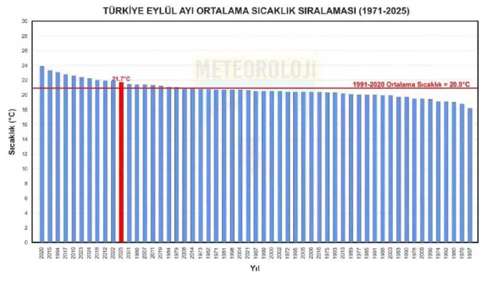 Meteoroloji Genel Müdürlüğü'nün açıkladığı rapora göre 2025 Eylül ayı ortalama sıcaklığı 1991–2020 normallerine kıyasla 0,8 derece artışla 21,7°C olarak ölçüldü. Bu değer, son 55 yılın en sıcak 11'inci Eylül ayı olarak kayıtlara geçti.