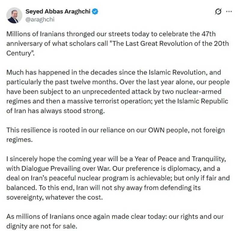 İslam Devrimi’nin 47’nci yıl dönümü dolayısıyla sosyal medya hesabından paylaşım yapan Arakçi, İran’ın son yıllarda ciddi baskılarla karşı karşıya kaldığını hatırlattı. Son 12 ayda ülkenin nükleer silaha sahip iki rejimin saldırılarıyla ve büyük çaplı terörist eylemlerle karşılaştığını ifade eden Arakçi, buna rağmen İran İslam Cumhuriyeti’nin güçlü duruşunu koruduğunu belirtti.