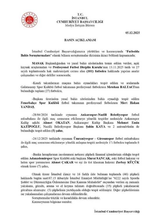 Soruşturmada elde edilen verilerin, hem alt liglerde hem Süper Lig çevresinde şüpheli finansal hareketleri ve bahis ilişkilerini ortaya çıkardığı belirtiliyor. Savcılık, yeni deliller ve bağlantılar doğrultusunda önümüzdeki günlerde dosyaya yeni isimlerin eklenebileceğini ifade ediyor.