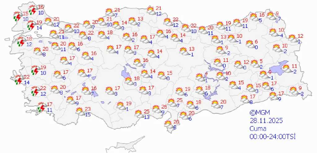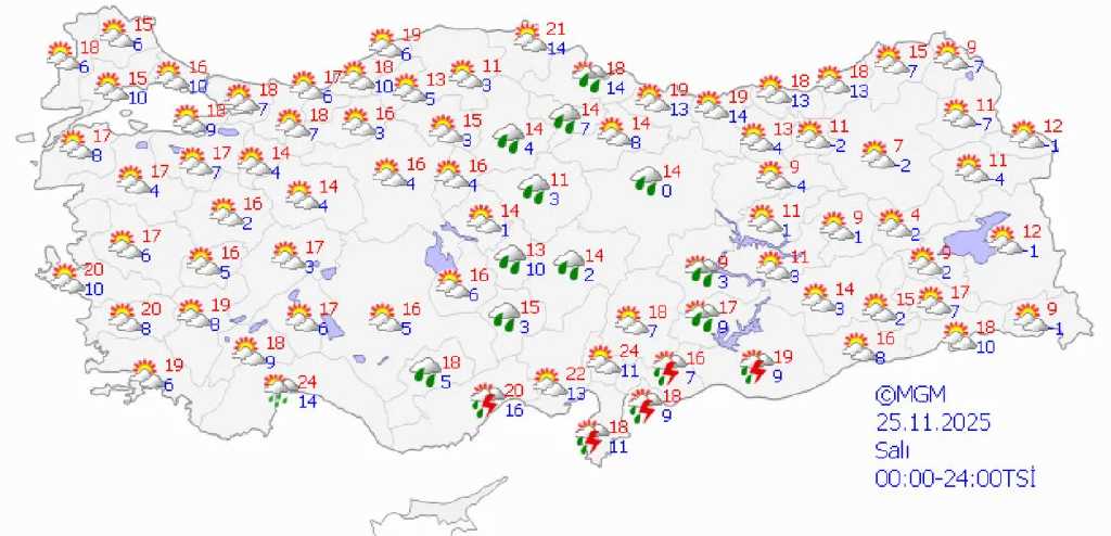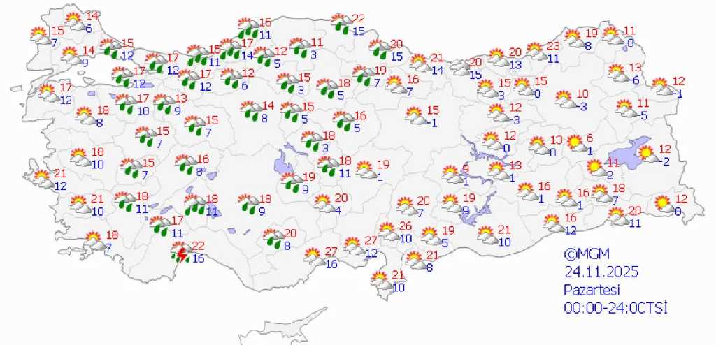 Meteoroloji Genel Müdürlüğü’nün (MGM) son değerlendirmelerine göre Türkiye yeni haftaya yağış ve fırtına ile giriyor. Ülkenin büyük bölümünde parçalı bulutlu hava hâkim olurken, Marmara, Ege, Akdeniz ve Karadeniz’de şiddetli sağanak yağışların etkili olması bekleniyor.