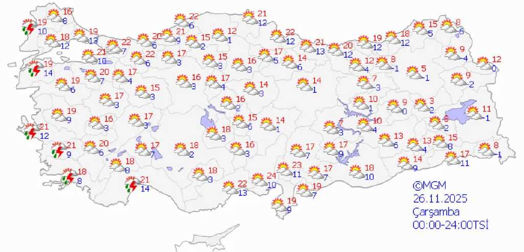 Perşembe günü yurt genelinde parçalı az bulutlu hava etkili olacak. Ancak Kıyı Ege ve Marmara’da yer yer sağanak yağış ihtimali bulunuyor. Sıcaklıkların artmasıyla gündüz 15-25 derece, gece ise 9-15 derece arasında hissedilecek.