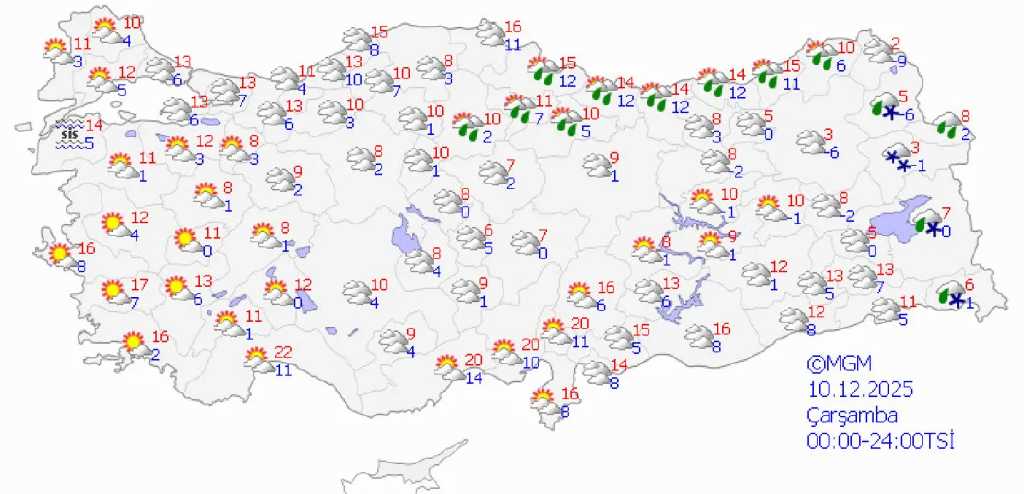 Sabah saatlerinde iç kesimlerde sis etkili olurken, sıcaklıkların Ankara’da 2-8 derece, Erzurum’da -2 ile 4 derece arasında seyredeceği tahmin ediliyor.
