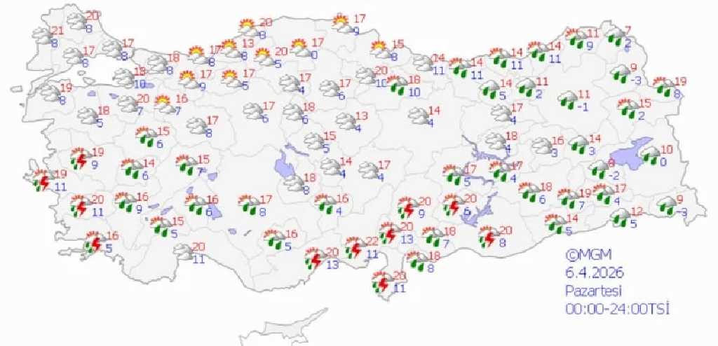 Yapılan tahminlere göre bugün özellikle Marmara’nın güneyi, Ege, Akdeniz’in iç kesimleri ve İç Anadolu’nun batısında sağanak ve gök gürültülü sağanak yağış görülecek. Doğu Anadolu’nun bazı bölgelerinde de yerel yağışlar etkili olacak.