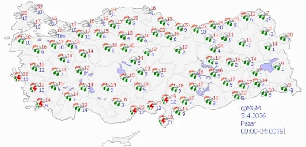 Pazar günü itibarıyla yağışlı bölgelerde azalma öngörülüyor. Ancak İç Anadolu, Ege’nin doğusu, Akdeniz ve Karadeniz’in iç kesimlerinde gök gürültülü sağanak yağışın etkisini sürdürmesi bekleniyor.