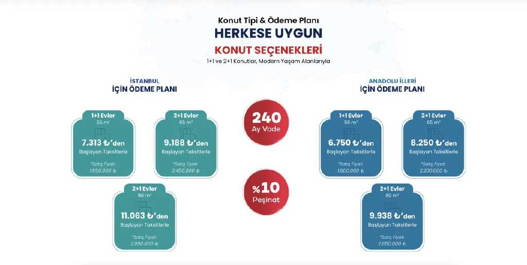 Anadolu illerinde 1+1 konutlar 1 milyon 800 bin liradan, 65 metrekarelik 2+1 konutlar 2 milyon 200 bin liradan, 80 metrekarelik 2+1 konutlar ise 2 milyon 650 bin liradan satışa sunulacak. Aylık taksitler ise 1+1 konutlarda 6 bin 750 lira, 65 metrekarelik 2+1’lerde 8 bin 250 lira, 80 metrekarelik 2+1’lerde 9 bin 938 lira olacak.