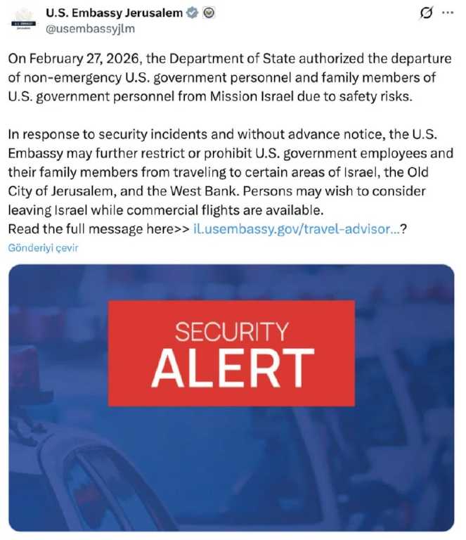 Açıklamada, gelişmelere bağlı olarak büyükelçilik çalışanlarının Kudüs’ün Eski Şehir bölgesi ve Batı Şeria dahil bazı bölgelere seyahatlerinin önceden bildirim yapılmaksızın kısıtlanabileceği ya da tamamen yasaklanabileceği belirtildi. Ticari uçuşların devam ettiği süreçte personel ve ailelerinin ayrılmayı değerlendirmesi tavsiye edildi.
