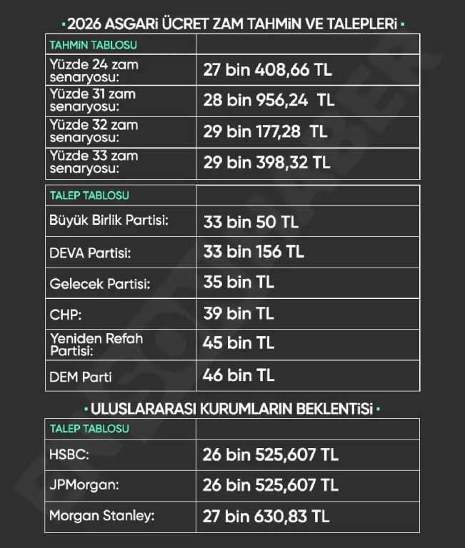 Farklı kesimler tarafından 2026 yılı için yüzde 20 ile yüzde 46 arasında değişen zam oranları dillendirilirken, yeni asgari ücretin 31 Aralık’a kadar netleşmesi planlanıyor. Çalışma ve Sosyal Güvenlik Bakanı Vedat Işıkhan, ikinci toplantıda rakam konuşulmasının erken olduğunu belirterek, tarafların görüşlerinin alınmasının öncelik olduğunu vurguladı.