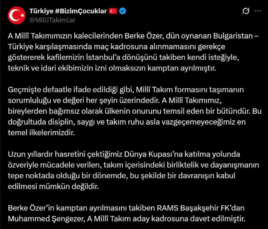 TFF’nin resmi internet sitesinden yapılan açıklamada, “A Milli Takımımızın kalecilerinden Berke Özer, Bulgaristan-Türkiye karşılaşmasında maç kadrosuna alınmamasını gerekçe göstererek kafilemizin İstanbul’a dönüşünü takiben kendi isteğiyle, teknik ve idari ekibimizin izni olmaksızın kamptan ayrılmıştır.” ifadeleri yer aldı.