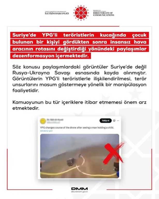 Cumhurbaşkanlığı İletişim Başkanlığı Dezenformasyonla Mücadele Merkezi, Suriye’de YPG’ye ait bir insansız hava aracının çocuk nedeniyle rota değiştirdiği yönündeki paylaşımların gerçeği yansıtmadığını açıkladı. Sosyal medyada dolaşıma sokulan görüntülerin dezenformasyon içerdiği belirtildi.