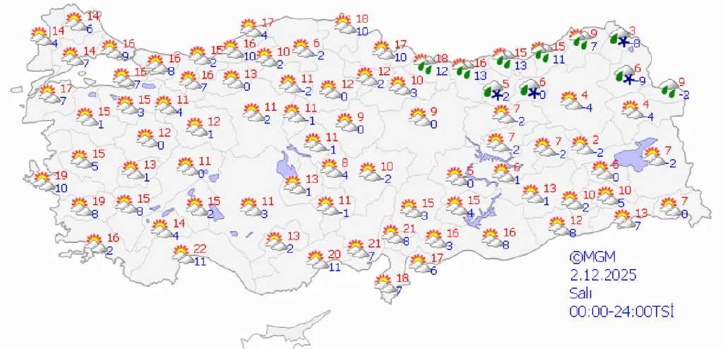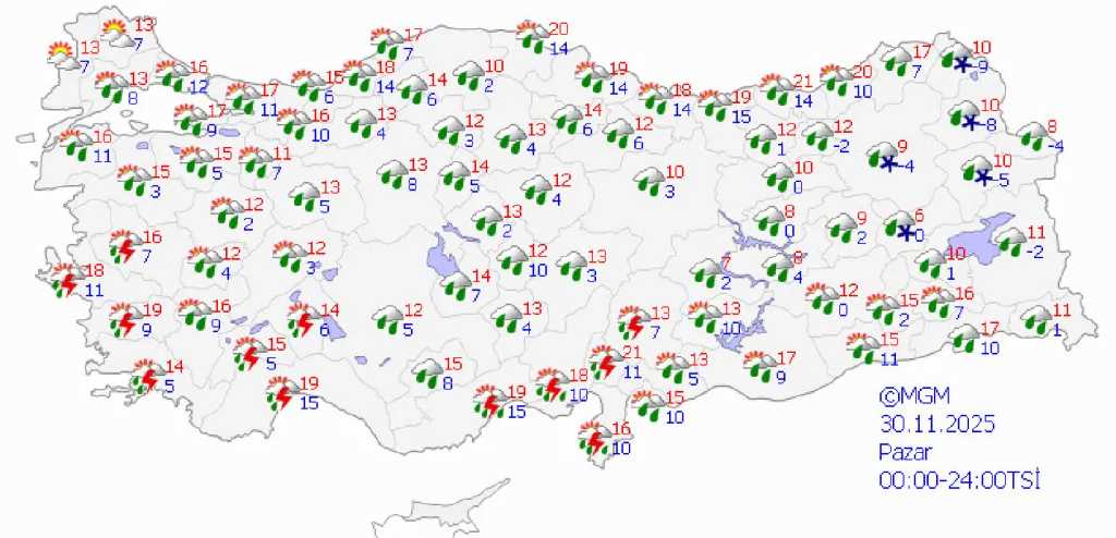 Marmara, Ege ve Akdeniz’de gök gürültülü sağanak beklenirken; İç Anadolu’nun doğusunun yüksekleri, Doğu Karadeniz’in iç kesimleri ile Doğu Anadolu’nun kuzey ve doğusunun yükseklerinde karla karışık yağmur ve kar yağışı tahmin ediliyor. Mersin, Adana ve Hatay kıyılarında ise yağışların yer yer kuvvetli olacağı belirtildi.