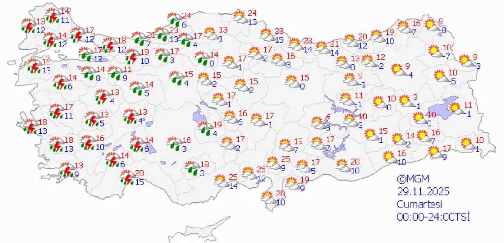 Meteoroloji Genel Müdürlüğü’nün değerlendirmelerine göre Türkiye hafta sonunu yağışlı bir hava ile geçirecek. Cumartesi günü kuzey, iç ve batı bölgelerde sağanak ve gök gürültülü sağanak etkili olurken, pazar günü Edirne ve Kırklareli dışında tüm yurtta yağış görülecek.