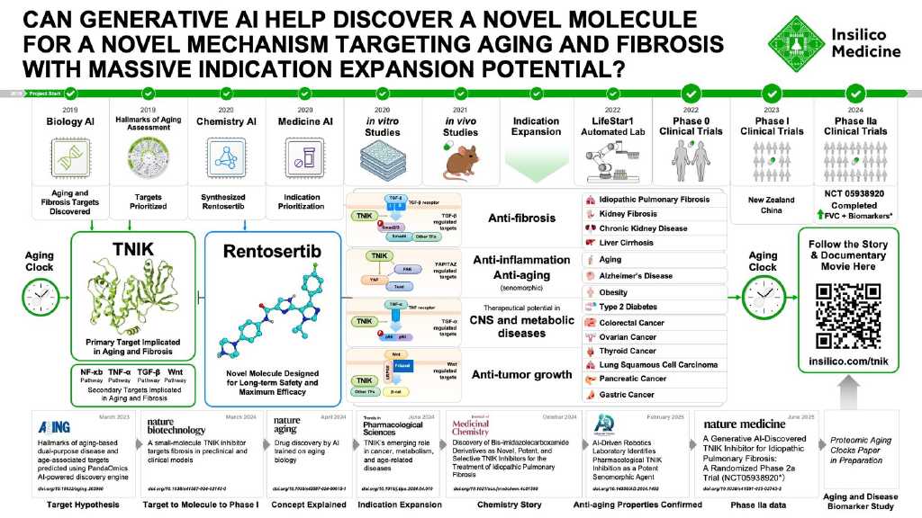 Insilico Medicine tarafından tamamen yapay zekâ kullanılarak tasarlanan Rentosertib adlı deneysel ilaç, onay öncesindeki son aşama olan Faz 3 klinik denemelere geçmeye hazırlanıyor.