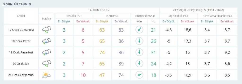 Pazar günü karla karışık yağmurun kent genelinde etkisini artıracağı, yüksek bölgeler ile kuzey ilçelerde ise yağışın tamamen kar şeklinde görüleceği tahmin ediliyor. Pazar sıcaklıklarının 3 ile 5 derece arasında kalacağı belirtiliyor. Kentin kuzey ve yüksek noktalarında kısa süreli kar örtüsü oluşma ihtimali bulunuyor.