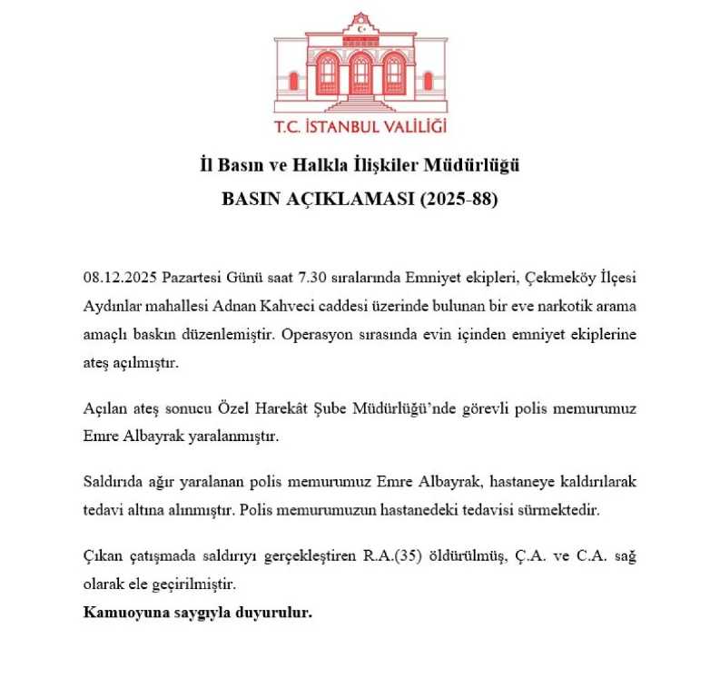 İstanbul Valiliği ilk açıklamasında operasyonun ayrıntılarını paylaşarak yaralı polis memurunun hastanede tedavisinin sürdüğünü bildirdi. Ardından yapılan ikinci açıklamada, Emre Albayrak’ın tüm müdahalelere rağmen kurtarılamayarak şehit olduğu duyuruldu.