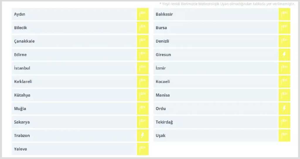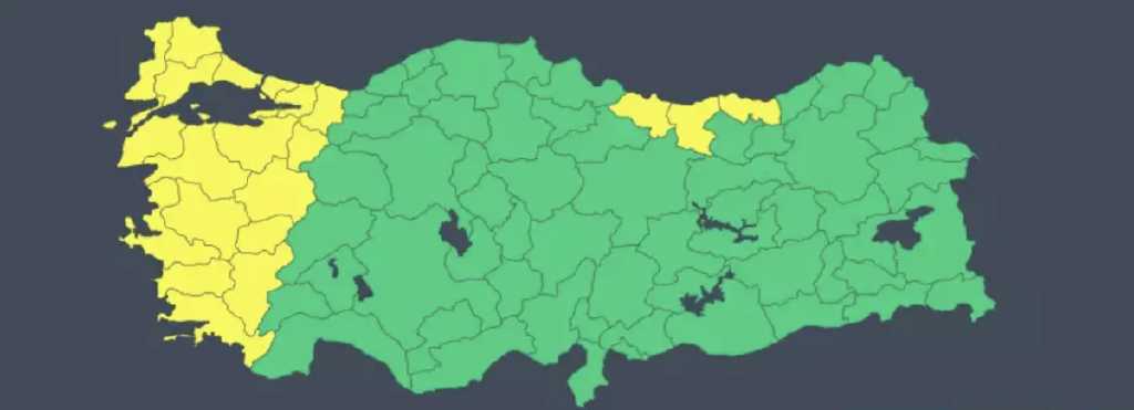 Kuvvetli rüzgar beklenen Aydın, Balıkesir, Bilecik, Bursa, Çanakkale, Denizli, Edirne, İstanbul, İzmir, Kırklareli, Kocaeli, Kütahya, Manisa, Muğla, Sakarya, Tekirdağ, Uşak, Yalova, kuvvetli yağış beklenen Giresun, Ordu ve Trabzon için "sarı" kodlu uyarıda bulunuldu.