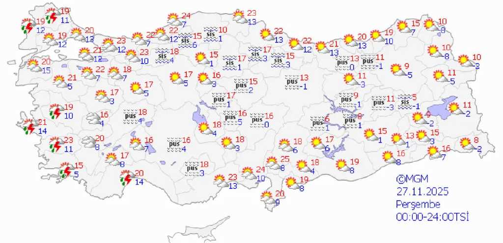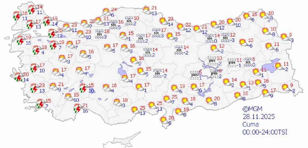 Türkiye’nin birçok bölgesinde hava değişkenlik gösterecek. Marmara Bölgesi’nde yağışlar beklenirken, Ege’de güneşli hava etkili olacak. Akdeniz’de parçalı bulutlu, İç Anadolu’da ise sisli hava öne çıkıyor. Karadeniz’de yağmurlu ve yer yer fırtınalı bir hava gözlenirken, Doğu Anadolu Bölgesi kar yağışıyla hafta sonunu karşılayacak. Güneydoğu Anadolu’da ise güneşli hava hakim olacak.