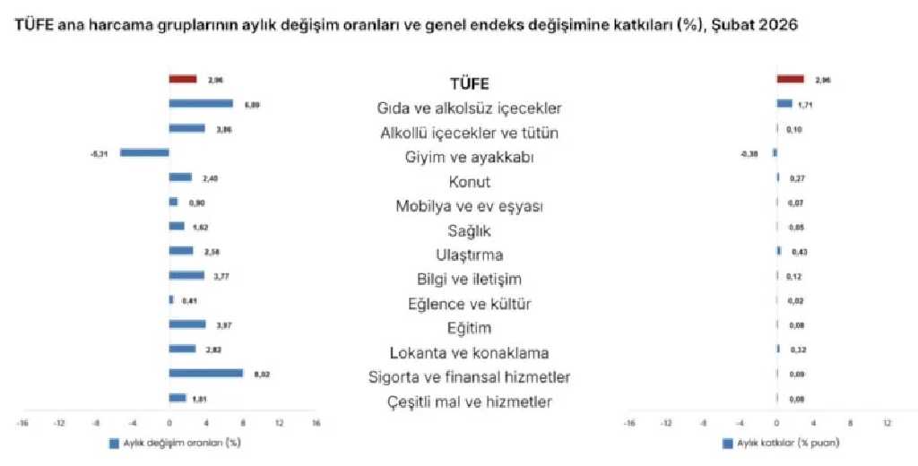 Türkiye İstatistik Kurumu (TÜİK), Şubat 2026 Tüketici Fiyat Endeksi (TÜFE) verilerini duyurdu. Açıklanan rakamlara göre TÜFE, şubatta aylık yüzde 2,96 artarken, yıllık enflasyon yüzde 31,53 seviyesine ulaştı.