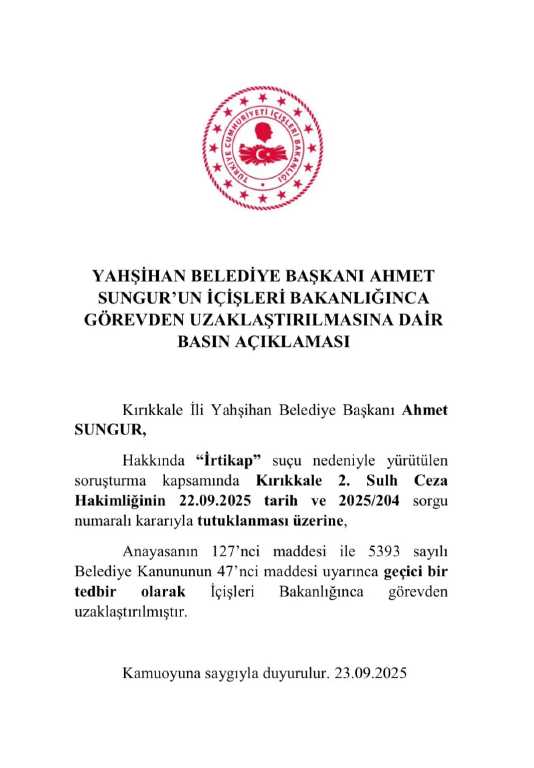 Bakanlık açıklamasında, Sungur’un “irtikap” suçundan yürütülen soruşturma çerçevesinde Kırıkkale 2. Sulh Ceza Hakimliği’nin 22 Eylül 2025 tarihli kararıyla tutuklandığı belirtildi. Açıklamada ayrıca, Anayasa’nın 127’nci maddesi ve 5393 sayılı Belediye Kanunu’nun 47’nci maddesi gereği tedbiren görevden uzaklaştırıldığı ifade edildi.