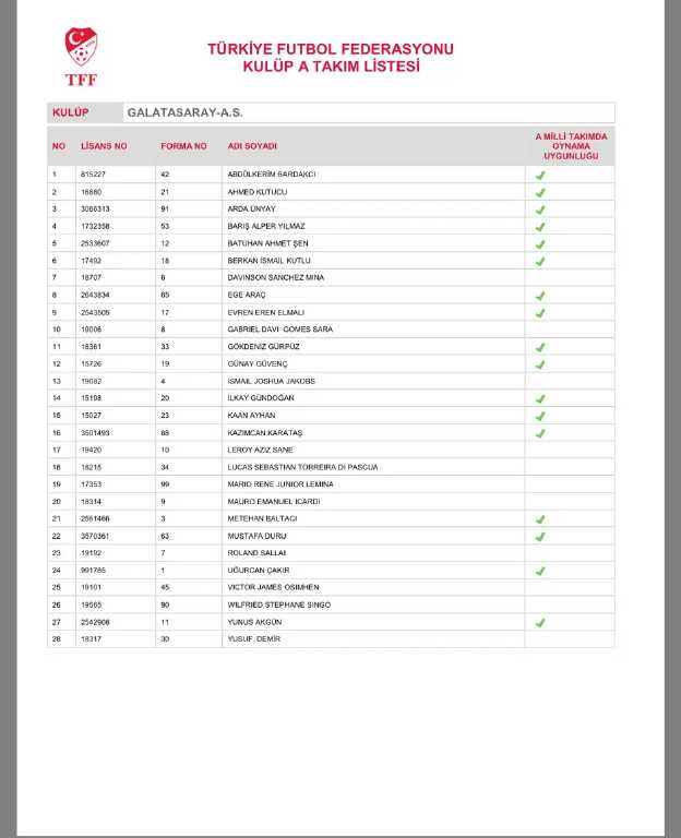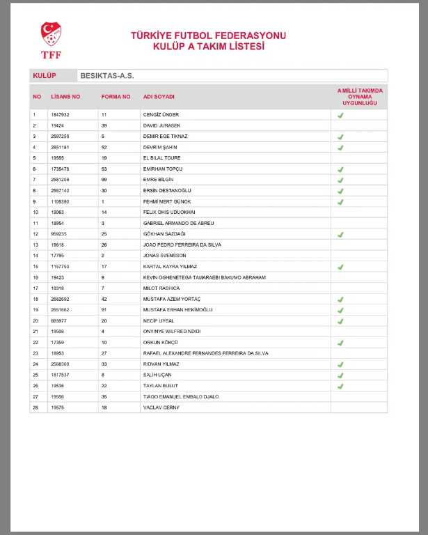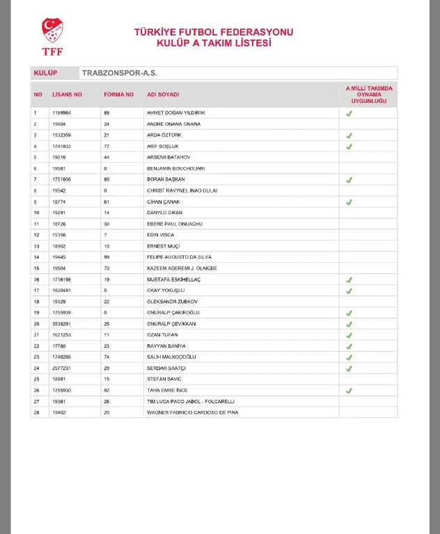 TFF, SÜPER LİG TAKIMLARININ KADROLARINI DUYURDU: İŞTE 4 BÜYÜKLERİN LİSTESİNDEKİ İSİMLER