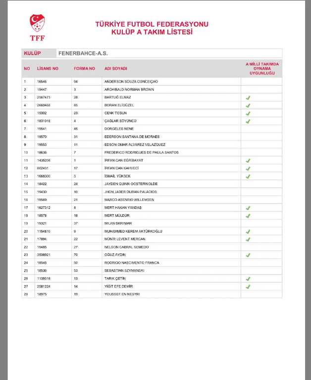 Jose Mourinho’nun çalıştırdığı Fenerbahçe’nin listesinde Dusan Tadic, Edin Dzeko, Ferdi Kadıoğlu, İsmail Yüksek ve Dominik Livakovic gibi kilit isimler dikkat çekiyor. Sarı-lacivertliler, transferin son günlerinde kadrosuna kattığı yeni oyuncularla geniş bir rotasyon oluşturdu.