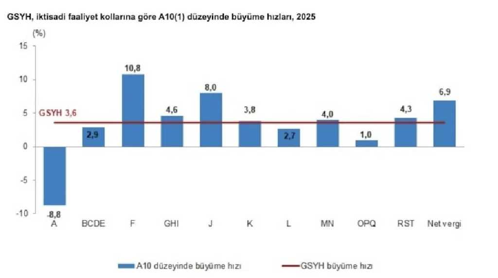 Faaliyet kollarına göre zincirlenmiş hacim endeksi incelendiğinde 2025 yılında en yüksek artış yüzde 10,8 ile inşaat sektöründe gerçekleşti. Bilgi ve iletişim faaliyetleri yüzde 8, ürün üzerindeki vergiler eksi sübvansiyonlar yüzde 6,9, ticaret-ulaştırma-konaklama ve yiyecek hizmetleri yüzde 4,6, diğer hizmet faaliyetleri yüzde 4,3 büyüme kaydetti. Finans ve sigorta faaliyetleri yüzde 3,8, sanayi yüzde 2,9, gayrimenkul faaliyetleri yüzde 2,7 artarken kamu yönetimi, eğitim, sağlık ve sosyal hizmet faaliyetleri yüzde 1 yükseldi. Tarım sektörü ise yüzde 8,8 daraldı.