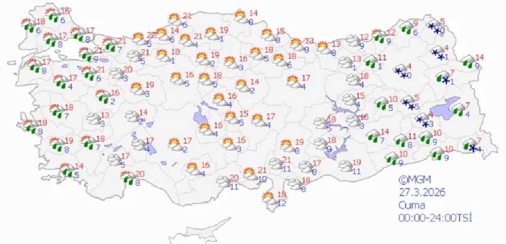 Yağışların genel olarak sağanak şeklinde görülmesi beklenirken, Doğu Anadolu’nun doğusu ile Doğu Karadeniz’in yüksek kesimlerinde karla karışık yağmur ve kar yağışı etkili olacak.