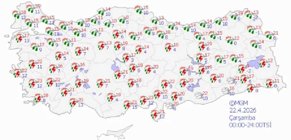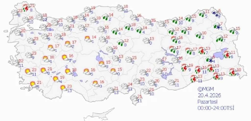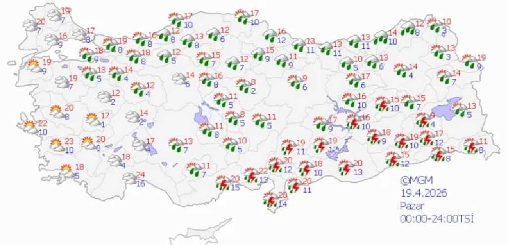 18-21 Nisan tarihleri arasında özellikle iç ve doğu kesimlerde yerel olarak kuvvetli yağış bekleniyor. Yetkililer, yıldırım, kısa süreli dolu ve ani sel riskine karşı dikkatli olunması gerektiğini bildirdi.