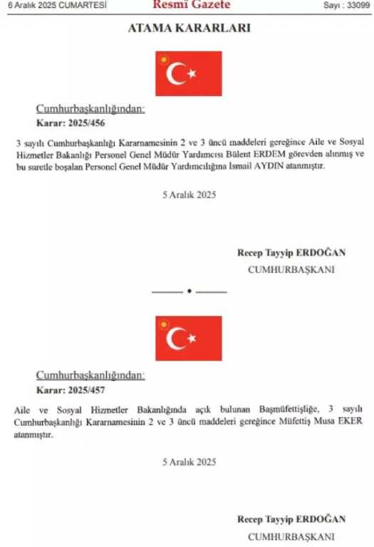 Aile ve Sosyal Hizmetler Bakanlığı Personel Genel Müdür Yardımcısı Bülent Erdem görevden alındı. Boşalan bu göreve İsmail Aydın atandı. Bakanlık bünyesinde açık bulunan Başmüfettişlik görevine ise Müfettiş Musa Eker getirildi.