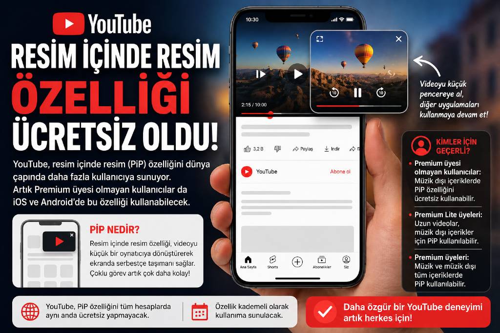 YouTube, PiP özelliğinin tüm kullanıcılara aynı anda açılmayacağını belirtti. Güncelleme kademeli olarak dağıtılacak ve zaman içinde daha fazla kullanıcıya ulaşacak.